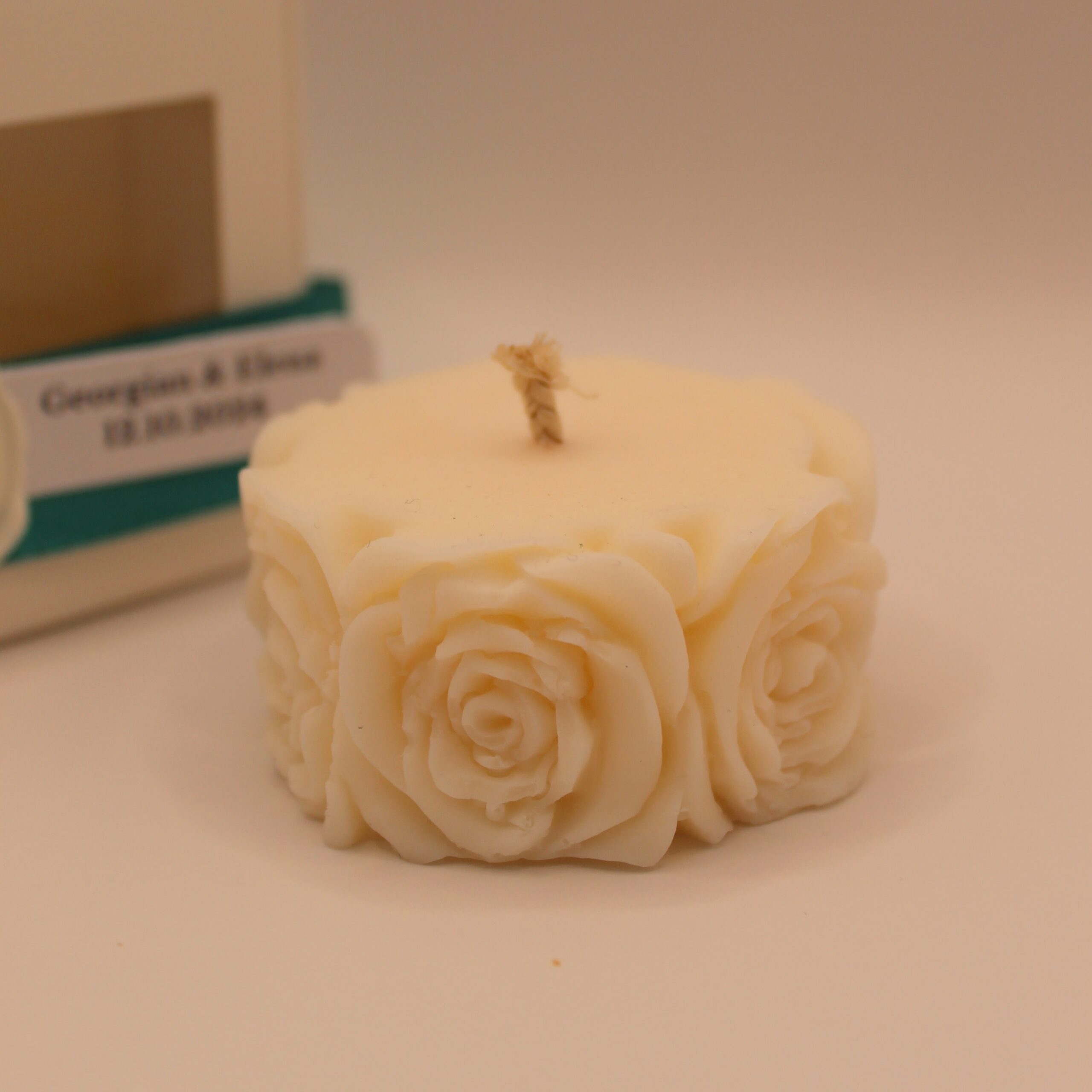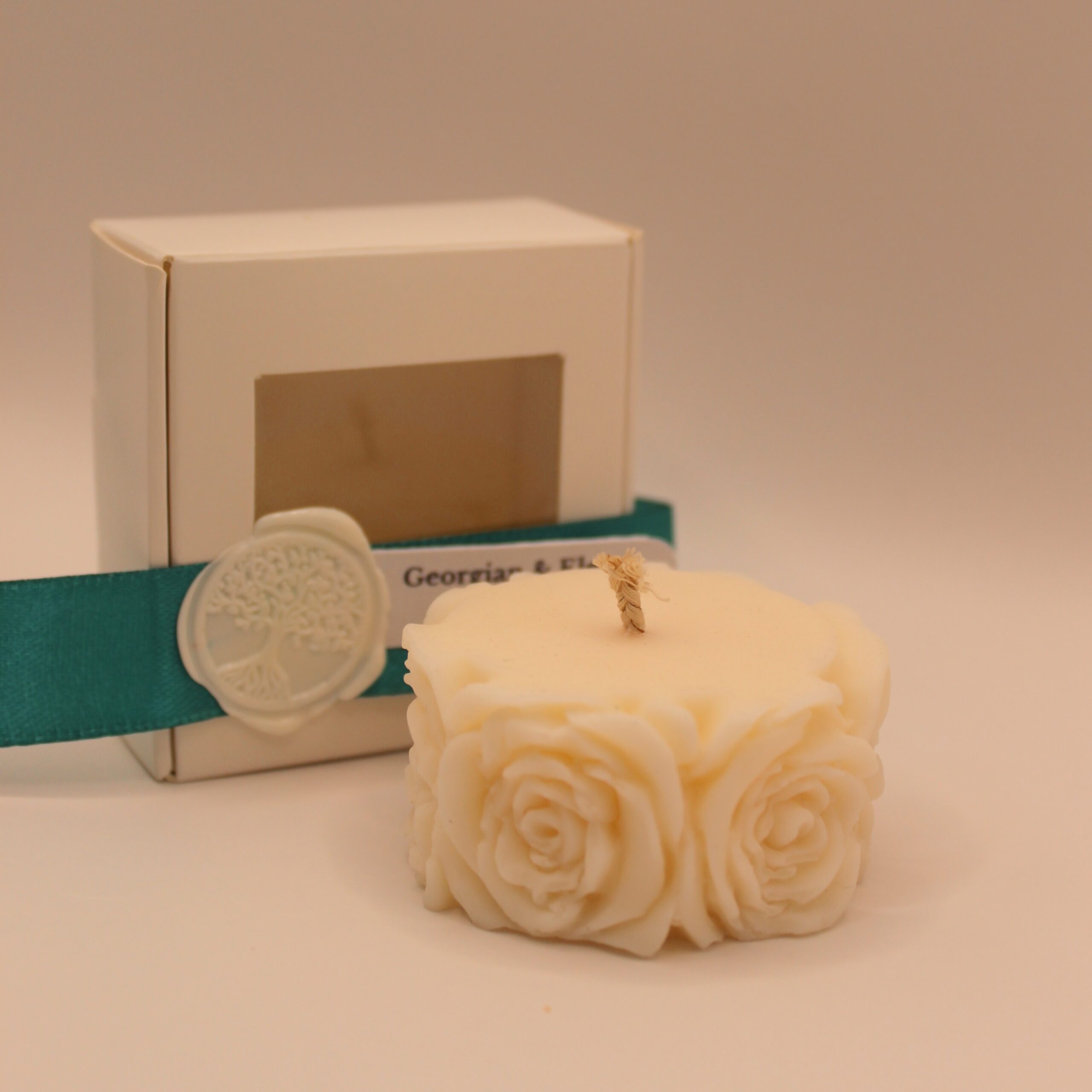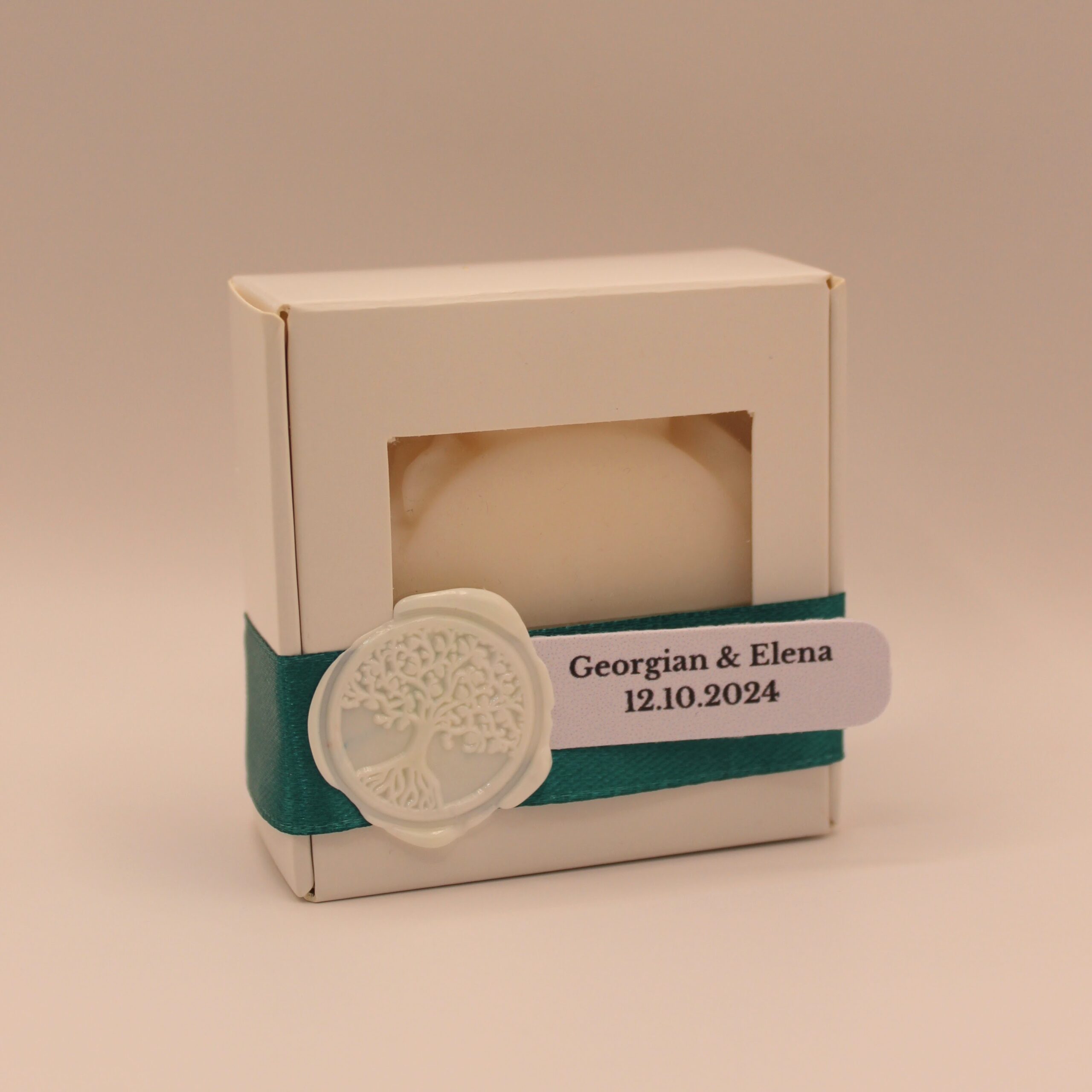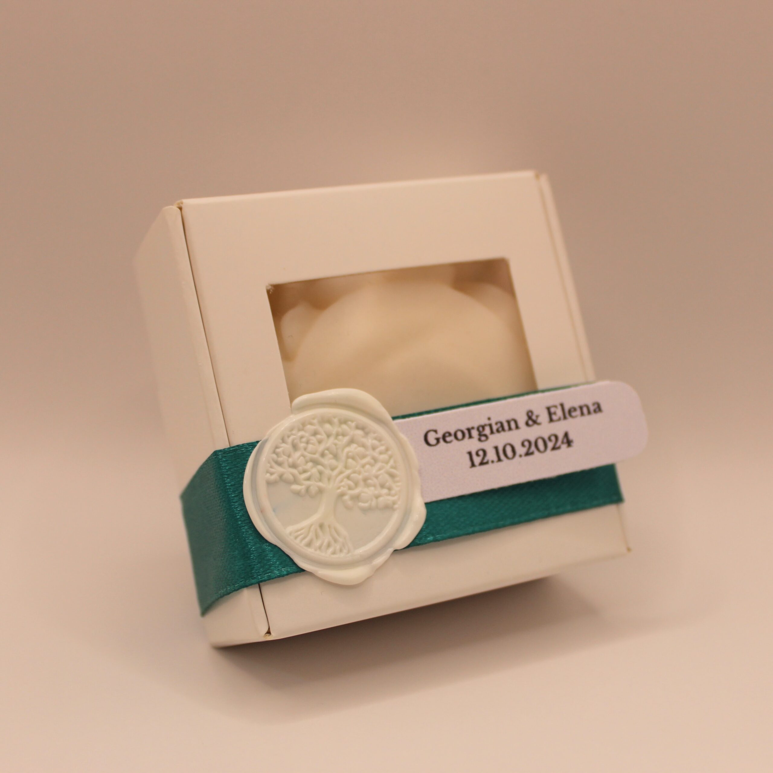 Ambalaj: Mărturia vine în cutie individuală din carton, cu fereastră pătrată. Cutia este legată cu panglică satinată, pe care este fixată cu sigiliu turnat manual o etichetă personalizată cu numele mirilor/bebelușului botezat.