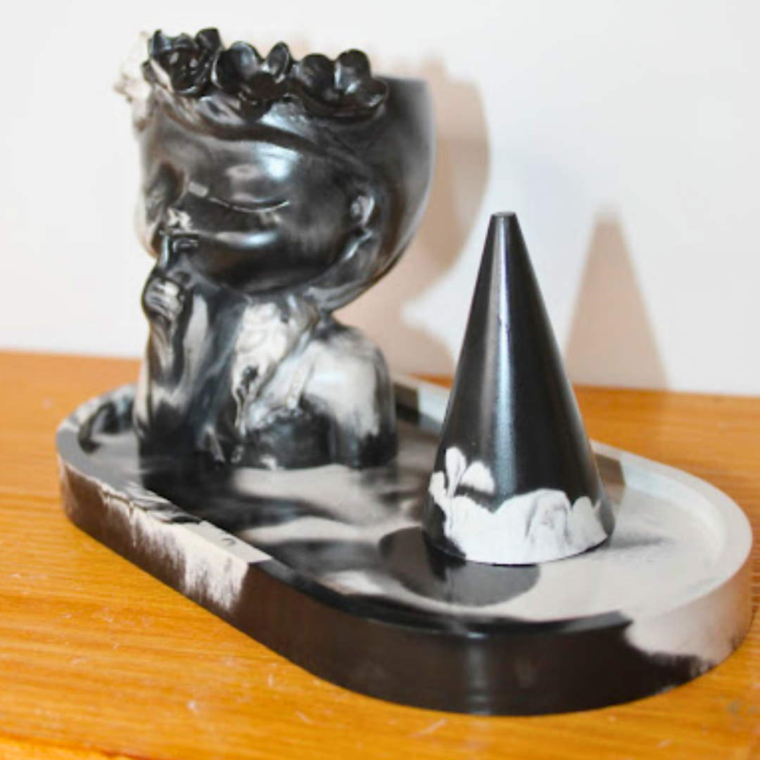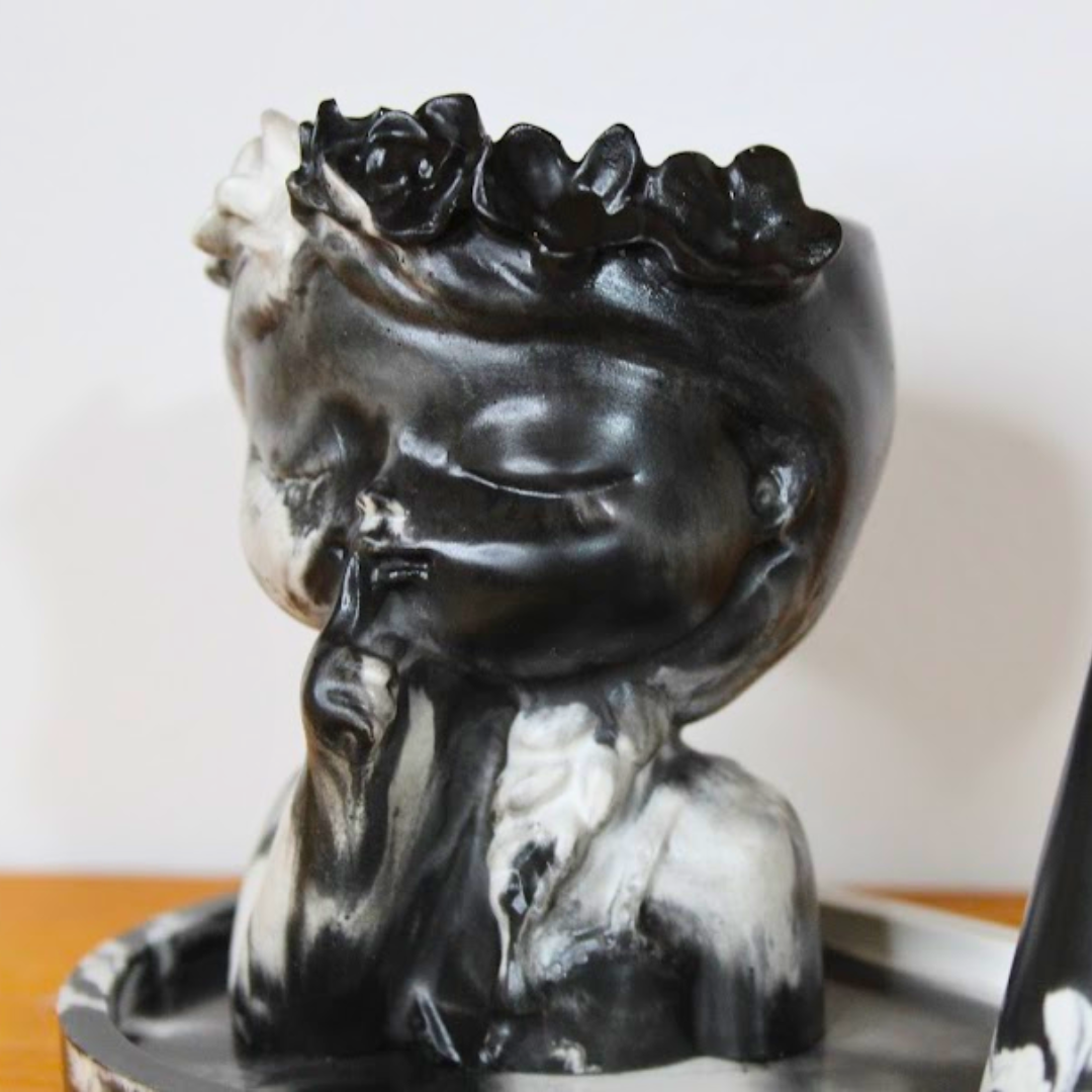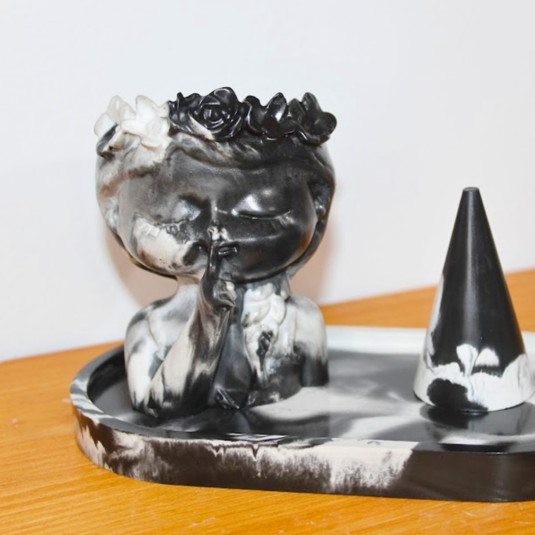 Set elegant și unic, realizat manual, compus dintr-o vază în formă de fetiță șoptitoare, o tavă ovală și un suport pentru inele, toate create din praf ceramic netoxic de înaltă calitate.